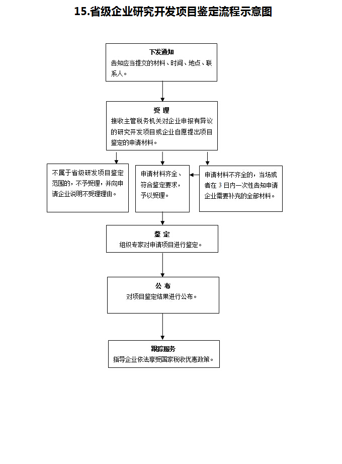| 鉴定 | 3.鉴定责任:组织专家按照科学技术部等部门颁布的《国家重点支持的高新技术领域》、国家发改委等部门颁布的《当前优先发展的高技术产业重点领域指南(2011年度)》、《财政部、海关总署、国家税务总局关于支持文化企业发展若干税收政策问题的通知》(财税〔2009〕31号)和《财政部、国家税务总局关于研究开发费用税前加计扣除有关政策问题的通知》(财税〔2013〕70号)文件对申请项目进行鉴定;如有异议,组织专家进行现场质疑;提出专家鉴定意见。 | 政策法规处 | 2日 | ||||||