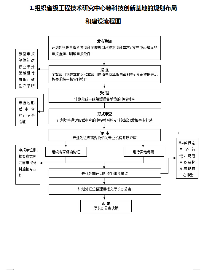 1 组织省级工程技术研究中心等科技创新基地的规划布局和建设     《中共河南省委河南省人民政府关于加快自主创新体系建设促进创新驱动发展的意见》(豫发〔2013〕7号)第七条:“(二十) 构建人才创新发展平台。通过建设重点实验室、工程技术研究中心、……等,为高层次科技人才创新创业创造条件。”