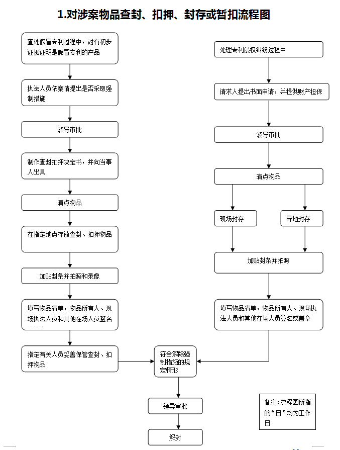 | 1 | 对涉案物品查封、扣押、封存或暂扣 | 《中华人民共和国专利法》第六十四条:“管理专利工作的部门根据已经取得的证据, 对涉嫌假冒专利行为进行查处时, 可以询问有关当事人, 调查与涉嫌违法行为有关的情况;对当事人涉嫌违法行为的场所实施现场检查; 查阅、复制与涉嫌违法行为有关的合同、发票、账簿以及其他有关资料;检查与涉嫌违法行为有关的产品,对有证据证明是假冒专利的产品,可以查封或者扣押。管理专利工作的部门依法行使前款规定的职权时,当事人应当予以协助、 配合,不得拒绝、阻挠。” 《河南省专利保护条例》(2000年11月25日河南省第九届人民代表大会常务委员会第十九次会议通过,2005年12月2日河南省第十届人民代表大会常务委员会第二十次会议修订)第二十四条第一款:“管理专利工作的部门处理专利侵权纠纷时,根据请求人的申请,经审查认为必要,可以封存或者暂扣与案件有关的货物、材料、专用工具、 设备等物品,并向被请求人出具封存或者暂扣物品的清单。” |