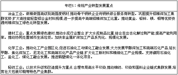 发展方式加快转变。科学发展载体持续完善,产业集聚区占全省规模以上工业增加值比重达到60.4%,提高20个百分点以上,商务中心区、特色商业区(街)加快发展。产业结构持续优化,服务业比重达到39.5%、提高8.9个百分点,高成长性制造业及高技术产业占规模以上工业增加值比重达到56.3%、提高15.5个百分点,装备、食品行业主营业务收入超万亿元。新型城镇化持续推进,中原城市群成为国家重点培育发展的中西部地区三大城市群之一,常住人口城镇化率达到46.85%,提高8.03个百分点,城乡一体化示范区建设全面展开。科技创新能力持续增强,全社会研发投入增长1倍,国家级研发中心数量翻一番,一批产业核心关键技术取得重大突破。现代要素市场、商品市场、服务市场持续完善,中原银行等“金融豫军”加快崛起。林业生态省建设取得明显进展,节能减排成效突出,提前一年完成“十二五”节能目标任务,预计单位生产总值能耗累计下降22.5%,主要污染物排放总量完成国家控制目标。