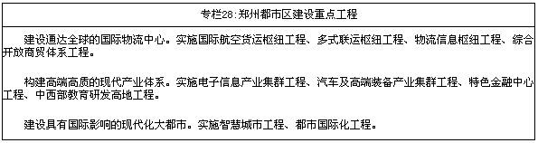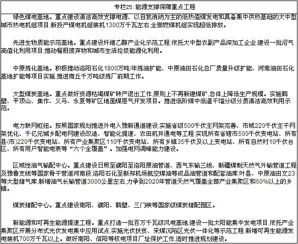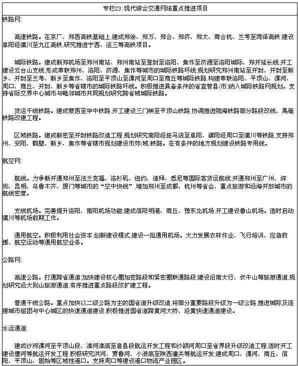 战略支撑更加坚实。中原经济区、郑州航空港经济综合实验区上升为国家战略,实验区建设“三年打基础”目标基本实现,现代综合交通枢纽、国际物流中心和全球智能终端制造基地初步形成。综合交通体系建设成效显著,郑州机场二期工程建成投用,航线网络不断完善,旅客吞吐量达到1730万人次、货邮吞吐量突破40万吨;米字形高速铁路网建设取得突破,石武高铁投运,郑徐高铁主体工程基本建成,郑万、郑合、商合杭高铁开工建设,郑济、郑太高铁前期工作取得重大进展,郑开、郑焦、郑机城际铁路投入运营,铁路营运里程达到5118公里,其中高速铁路865公里,城际铁路171公里;高速公路通车里程达到6305公里,实现所有县(市)20分钟上高速,普通干线公路、农村公路服务水平进一步提升。信息网络系统不断完善,郑州成为国家级互联网骨干直联点,跻身全国十大通信网络交换枢纽,全省乡镇以上区域实现4G(第四代移动通信)网络全覆盖,“全光网河南”建成。水利支持能力明显增强,南水北调中线一期工程如期通水、丹江口库区移民迁安四年任务两年完成,河口村水库完工蓄水,出山店、前坪水库及一批引黄调蓄工程开工建设。能源支撑能力稳步提升,疆电入豫等重大工程建成投运,电力总装机达到6800万千瓦,基本实现管道天然气县县通。黄河滩区居民迁建试点启动,第一批试点部分群众入住安置区。